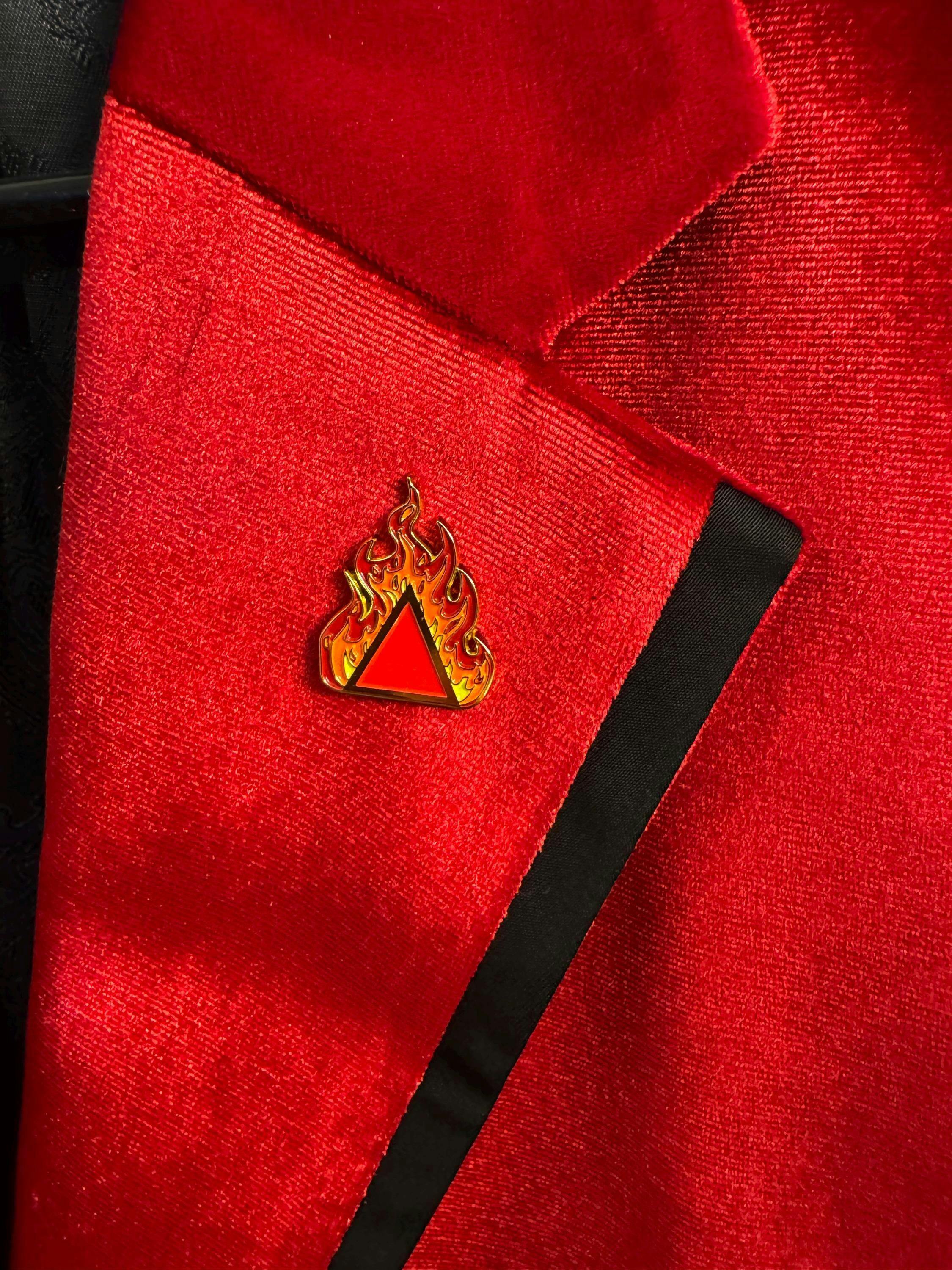 Light up your wardrobe with this alchemical fire lapel pin! This alchemy pin is a must have for any fashionable alchemist with a flare for the dramatic!