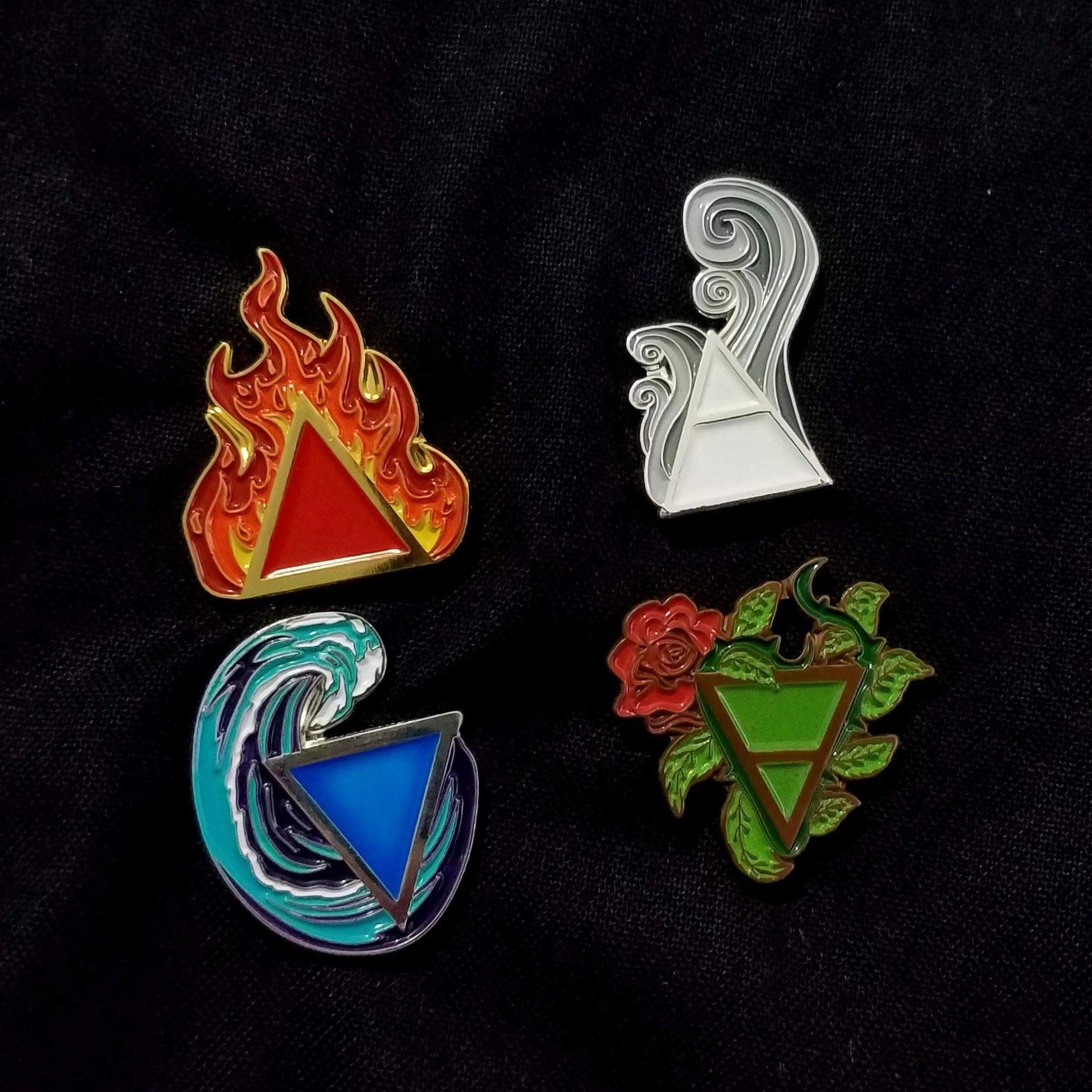 Mercury - One of the Three Alchemy Primes (Tria Prima). Show your alchemy credentials to the world with this soft enamel pin customized to show both the elemental alchemical sign of mercury, as well as an artistic representation of the element. Wearable without the risk of Mercury poisoning or it suddenly turning to liquid!