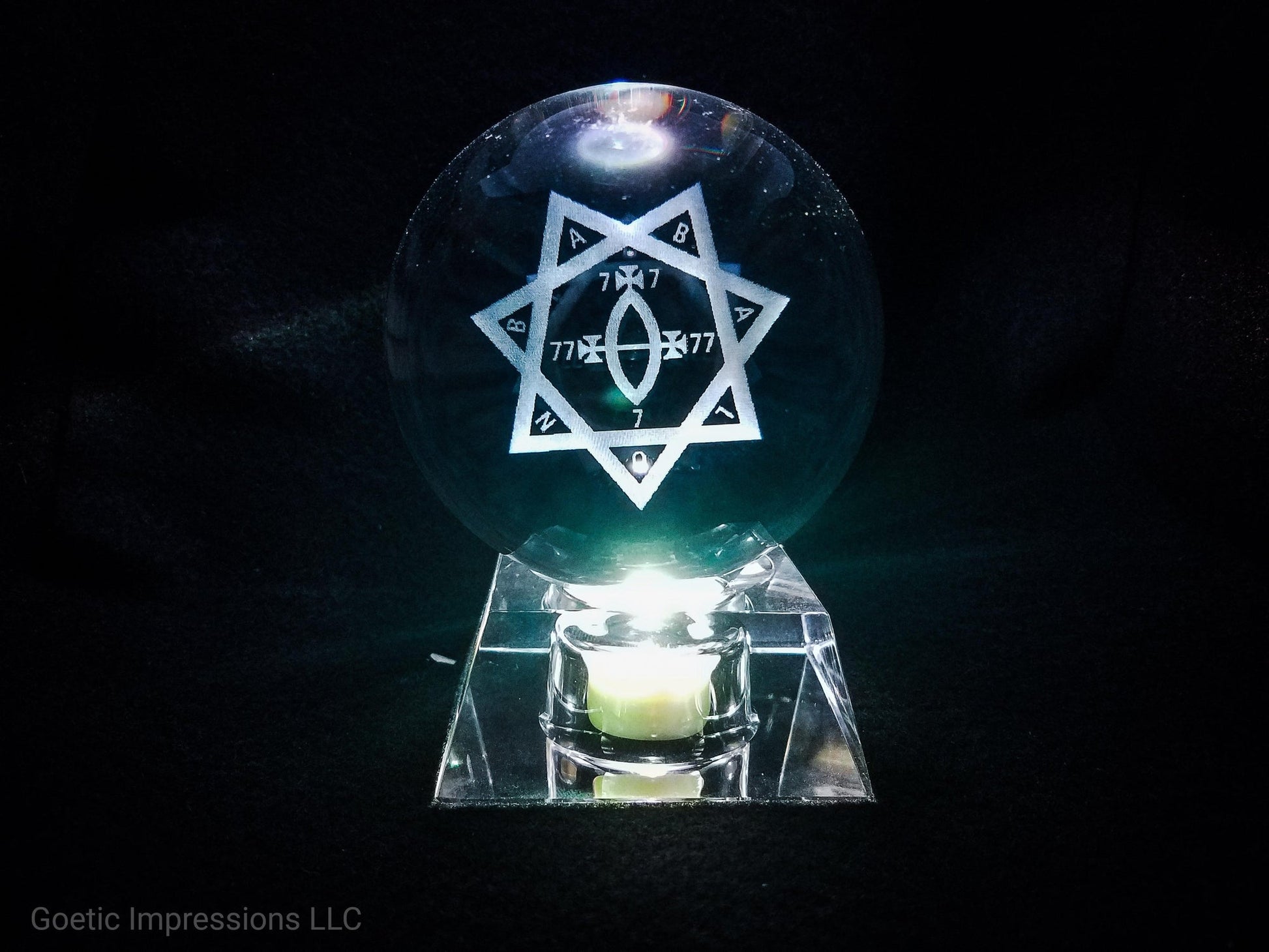 The ideal crystal ball to complement your Babalon altar, or for scrying use in your rituals. This crystal ball contains the sigil of the A.'.A.'. as transmitted by V.V.V.V.V. A beautiful addition to any magickal arsenal, this crystal ball is a must have for any practicing magician.